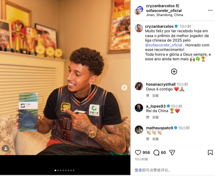 克雷桑在社媒写道:“非常高兴今天在家里收到了Sofascore颁发的2025年度中超联赛最佳球员奖项,非常感激获得认可!所有的荣耀都属于上帝,希望今年能获得更多荣誉。”